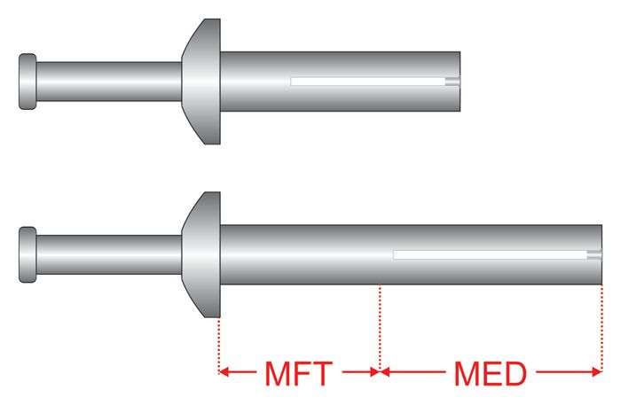 Using a Rotary Hammer tool or a suitable Impact tool, drill a hole into the concrete or masonry substrate to a depth of at least that of your maximum intended embedment depth of the Metal Drive Anchor PLUS an additional depth of at least 1 to 1.5 times the diameter of the specific Metal Drive Anchor being used.