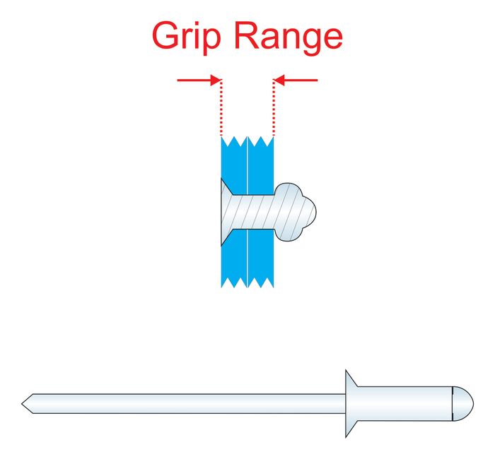 All rivets have a minimum and maximum thickness of materials for which they are designed to fix, this is known as the Grip Range of the rivet. Using a rivet with the correct Grip range for your application will ensure ease of installation and that the maximum holding power is achieved.