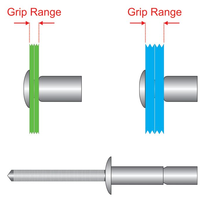 All rivets have a minimum and maximum thickness of materials for which they are designed to fix, this is known as the Grip Range of the rivet. Using a rivet with the correct Grip range for your application will ensure ease of installation and that the maximum holding power is achieved.