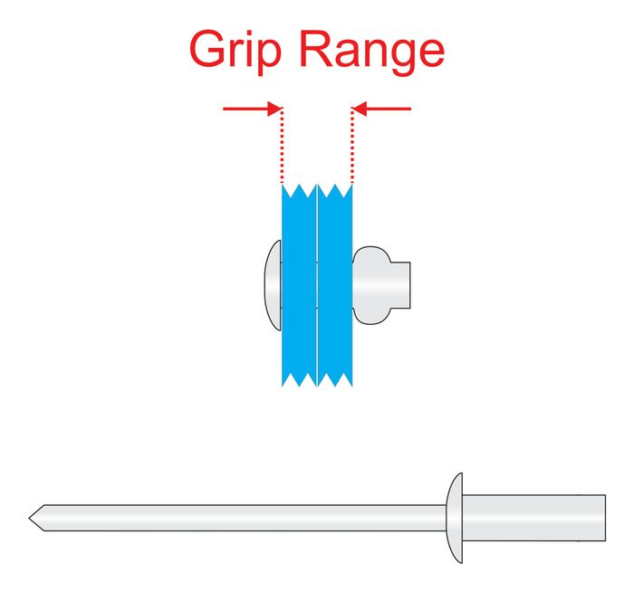 All rivets have a minimum and maximum thickness of materials for which they are designed to fix, this is known as the Grip Range of the rivet. Using a rivet with the correct Grip range for your application will ensure ease of installation and that the maximum holding power is achieved.