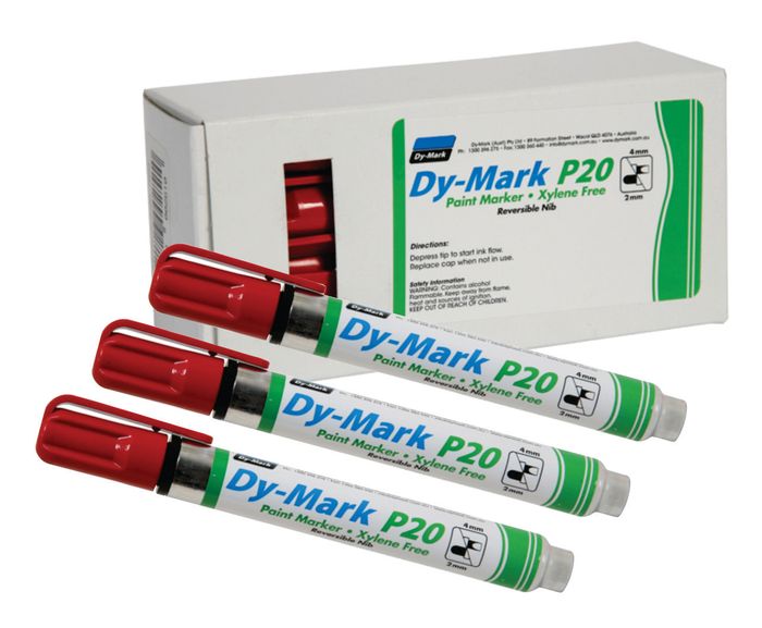 P20 Paint Marker Pen This product is a high performance paint marker and is xylene free and a fast dry formula. Featuring a dual reversible nib use the chisel tip for a 4mm mark width or reverse it and use the Bullet tip for a 2mm mark width with both options resulting in bold, easy to read marks. With a capacity of 13cc the pen is 135mm long and 16mm wide and comes with colour coded lids for easy identification. Replacement Tips are available upon request.