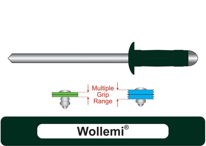 • The Multi-Grip feature allows for one rivet to be used in multiple material thicknesses as the 2 step double bubble effect covers a Grip Range that would normally require 2 to 3 different rivets.