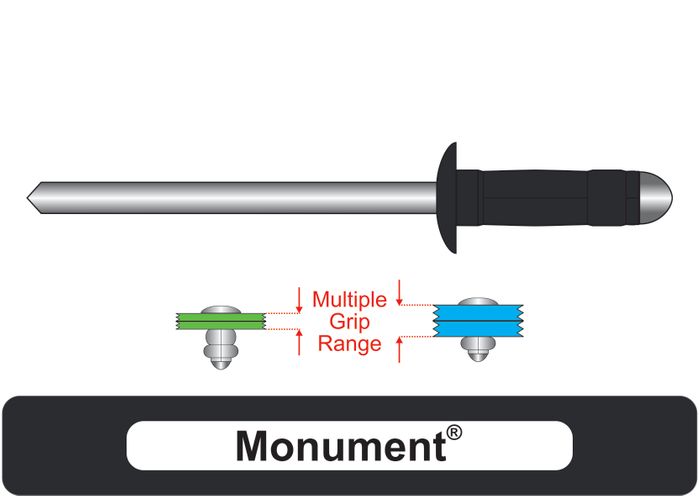 • The Multi-Grip feature allows for one rivet to be used in multiple material thicknesses as the 2 step double bubble effect covers a Grip Range that would normally require 2 to 3 different rivets.