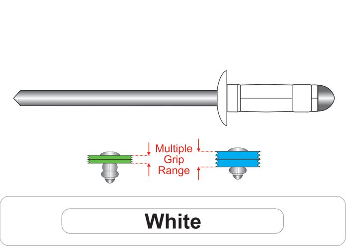 • The Multi-Grip feature allows for one rivet to be used in multiple material thicknesses as the 2 step double bubble effect covers a Grip Range that would normally require 2 to 3 different rivets.