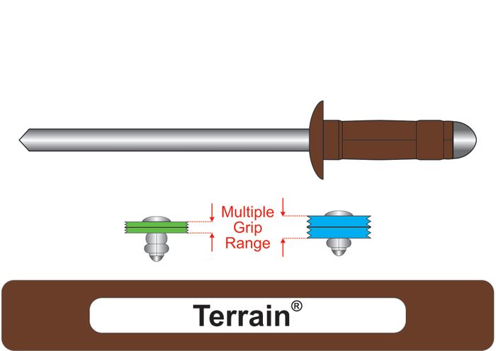 • The Multi-Grip feature allows for one rivet to be used in multiple material thicknesses as the 2 step double bubble effect covers a Grip Range that would normally require 2 to 3 different rivets.