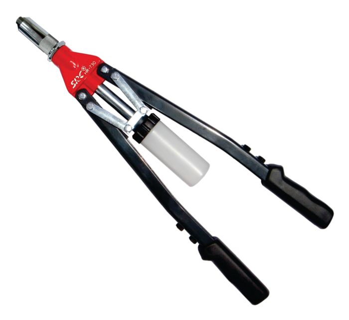 Ideal HR-730 Professional Tradesman's Heavy Duty Lever Action Riveter. Designed for heavy duty use. • Capacity:- Sets up to 6.4mm (1/4") rivets in all rivet material types. • Pack includes Five interchangeable nosepieces with wrench to suit. • Weight 1845g • Length 540mm