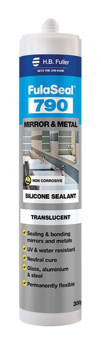 FulaSeal™ 790 Mirror & Metal Silicone is a premium quality, neutral cure, silicone adhesive/sealant It is ideal for a wide range of glazing applications including bonding standard silver-backed mirrors to walls and other general purpose metal bonding and sealing applications requiring a professional quality, silicone.