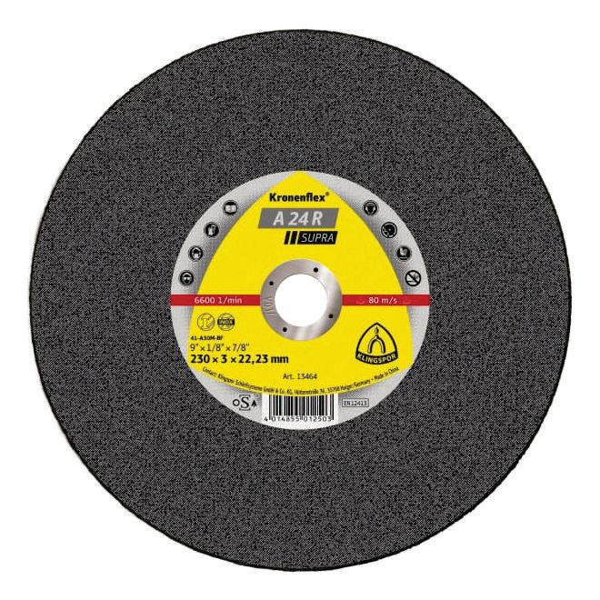 Klingspor A 24 R Supra Standard Thickness Cutting Off Wheel for Metal This wheel offers optimised properties for a wide variety of steel processing applications that stem from its structure and grain composition. Its wide-ranging application includes work on such materials as steel, stainless steel and cast iron. This wheel provides extra long service life and powerful cutting performance and will retain its removal rate over time.