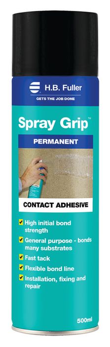 Spray Grip™ is a general purpose contact spray adhesive formulated to have excellent spraying and application characteristics and bonds to a wide variety of substrates. It offers high initial bond strength for instant results and is suitable for fast bonding applications without the need for clamping and has low odour and low VOC.