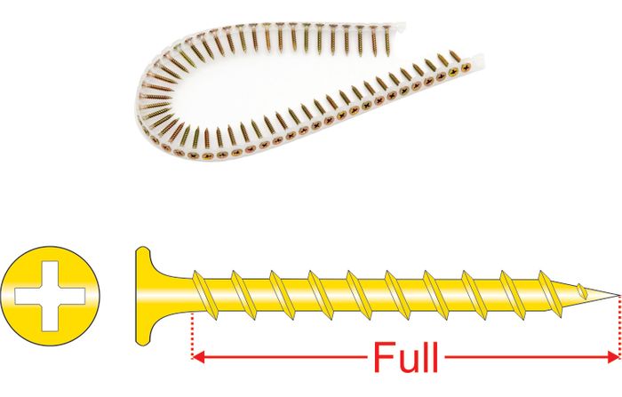 Designed for fixing plasterboard to timber studs, the curved underside of the head eliminates tearing of the paper lining on the board during installation. Featuring a Coarse thread for strong hold in softer timbers and composite board applications. Collated into plastic strips of 50 for use with collated power tools for high volume use, these screws offer time and labour saving benefits to the tradesman. Fits all popular brands of collated screwdrivers including Makita, De Walt etc.,