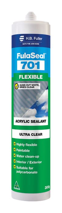 FulaSeal™ 701 Flexible Ultra Clear Sealant is an easy to use, highly flexible, water based sealant, which dries clear and will not attack plastics or metals. It is suitable for many interior and exterior applications and combines high joint movement characteristics with excellent weather resistance.