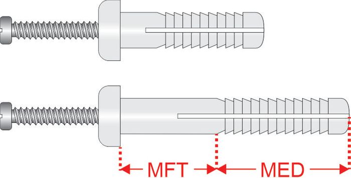Using a Rotary Hammer tool or a suitable Impact tool, drill a hole into the concrete or masonry substrate to a depth of at least that of your maximum intended embedment depth of the Nylon Drive Anchor PLUS an additional depth of at least 1 to 1.5 times the diameter of the specific Nylon Drive Anchor being used.